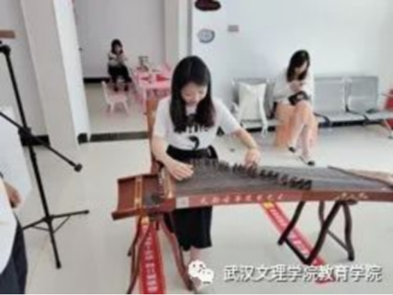教师团队的第三个节目由学前教育教师张澜和夏江南合奏《唱支山歌给党听》。教师张澜弹奏古筝,教师夏江南演奏电子琴,两位老师的合奏,精彩地演绎出对党的真挚情感。