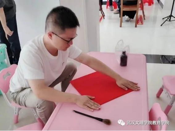 教育学系周志远老师将演出毛笔字送“福”节目,大家正在为该节目做好前期准备工作。