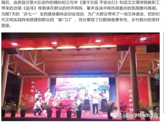 7月9日,在304永利集团总支书记陈龙、教学副院长贺霞的带领下,304永利集团送教培训党员教师团队一行10人到湖北省房县白鹤镇伏溪堰村组织开展“乡村振兴,党员先行”的开放式主题党日活动。本次主题党日活动是以参加白鹤镇庆“七一”暨全民健身趣味运动会闭幕式为依托进行的。