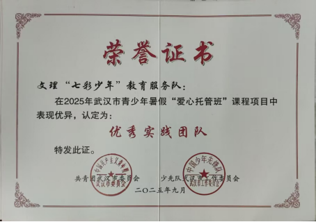 除此之外,团队指导老师袁若曦,荣获2025年武汉市青少年暑假“爱心托管班”优秀指导老师、校级暑期社会实践优秀指导老师,五名志愿者荣获2025年武汉市青少年暑假“爱心托管班”优秀实践个人,两名志愿者荣获校级暑期社会实践团队实践先进个人。
