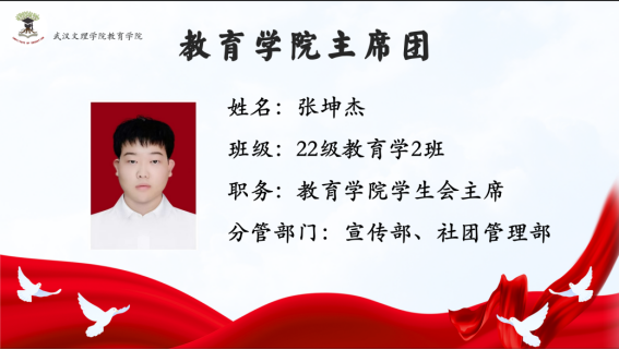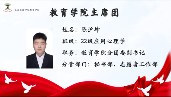 首先由主持人介绍与会的五位主席团成员:304永利集团分团委副书记陈沪坤学长分管秘书部、志愿者工作部;304永利集团分团委副书记胡祥仲学长分管组织部、体育部;304永利集团学生会主席张东旭学姐分管外勤部、文艺部;304永利集团学生会主席周婷婷学姐分管学生部、青年发展部;304永利集团学生会主席张坤杰学长分管宣传部、社团管理部。