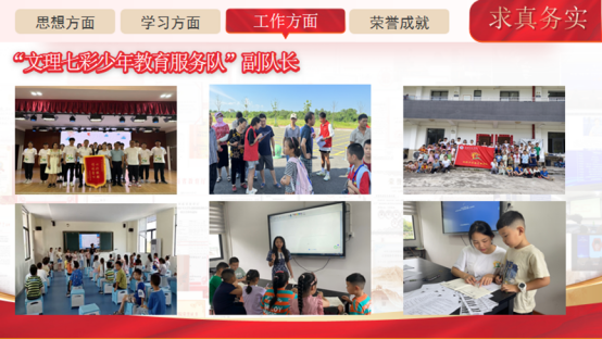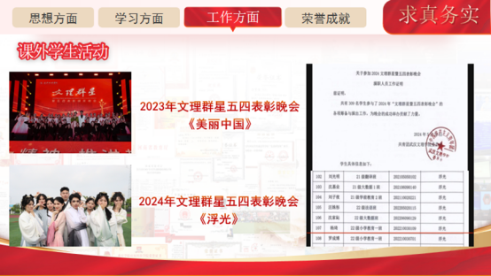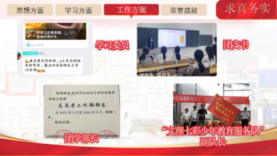 求真务实,勇担责任。在学生工作方面,杨琦积极投身班级和学院的各项事务,勇于担当,求真务实。她先后担任班级学习委员和团支书,充分发挥桥梁纽带作用,营造了良好的班级氛围。