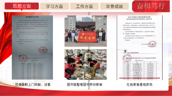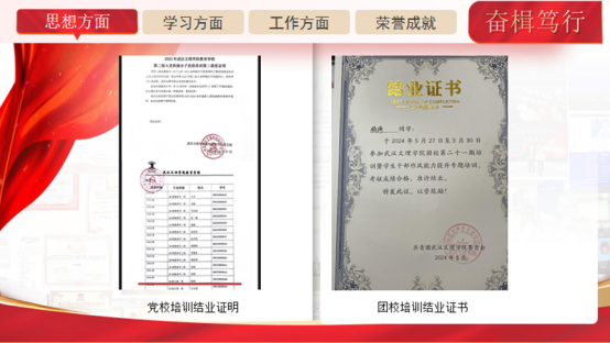 奋楫笃行,锤炼思想。在思想建设上,杨琦同学始终坚持正确的政治方向。大一入学起她便积极递交入党申请书,通过自己的努力在大二成为了入党积极分子,在大三学年成为党发展对象,现如今通过考试考察学习已顺利成为中共预备党员。她积极参与各类思想政治活动及劳动教育,获得党校和团校培训结业证书。作为团支书,她积极在班级内开展团日活动,引领同学们的思想向党不断靠拢。