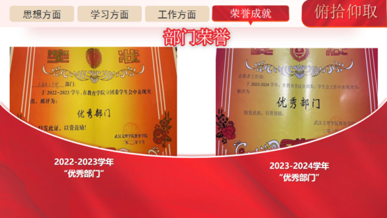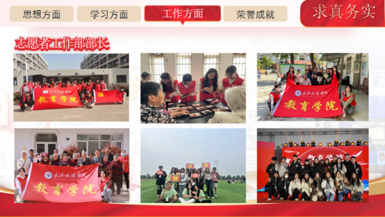 在304永利集团分团委志愿者工作部担任部长期间,她带领部门成员积极开展志愿服务活动,配合学院的各项工作。她带领的部门获得了23届团学“优秀部门”。在工作之余,她也充分利用自身艺术特长,参与各类文艺活动,展现了文理学子的风貌。