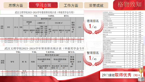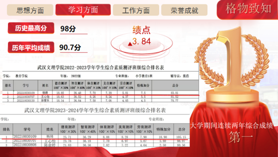 格物致知,深耕学术。作为一名小学教育专业的学生,杨琦深知专业知识的重要性。她在学习上刻苦钻研,精益求精。在大二学年总成绩位居班级第一,连续两年综合测评成绩位居班级第一,平均成绩90.7,绩点3.84,必修课程中29门成绩达到90分以上。