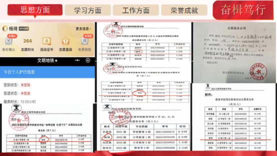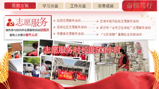她热衷于志愿服务,将服务他人、回馈社会作为行动准则。大学期间,她参与了“七程彩假期”暑期社会实践活动、武汉空港半马拉松志愿服务、抗击疫情志愿服务等,累计参加志愿服务近百次,服务人数近千人次,志愿时长近500小时。