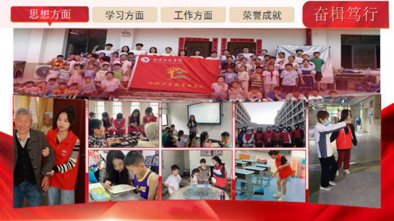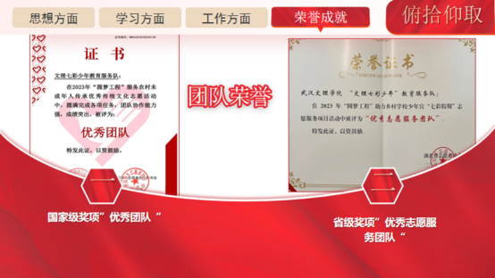 所在团队“文理七彩少年教育服务队”获得“圆梦工程”国家级“优秀团队”、省级“优秀志愿服务团队”、校级“社会实践优秀团队”以及“优秀团队”