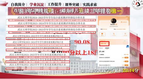 学业上,她在校期间连续三年专业与综合测评排名位列第一,34门专业课平均分90.08,18门课程超90分,第二课堂学分23.14分遥遥领先,普通话水平达一级乙等,专业资质扎实过硬。