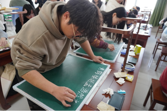 随后,参赛选手们纷纷拿起手中的书写工具,全神贯注地投入到比赛中。有的同学挥毫泼墨,书写出一幅幅气势磅礴的毛笔作品;有的同学在黑板上用粉笔勾勒出一个个工整美观的粉笔字;还有的同学用钢笔在纸上书写出一行行流畅精致的硬笔书法。比赛现场气氛热烈,同学们用笔墨书写青春,用行动诠释文化,展现出永利集团304学子对书法艺术的热爱与追求。