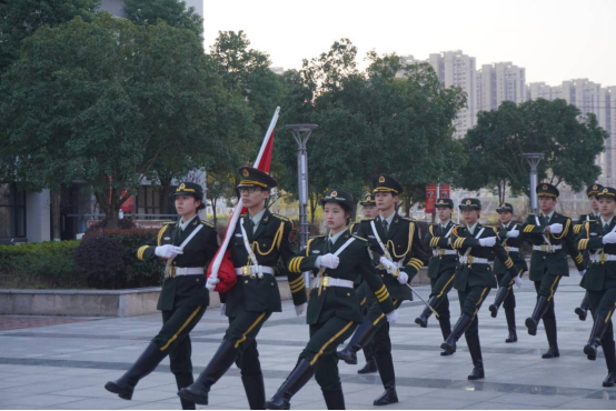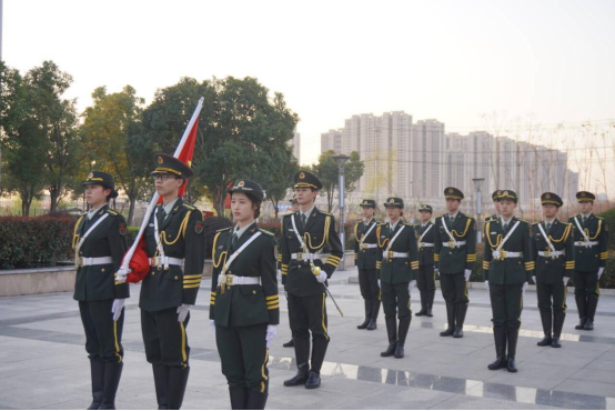 国旗护卫队队员们迈着铿锵有力的步伐,身姿挺拔、目光坚定,护送国旗至升旗台,展现出新时代青年对国旗的崇高敬意。伴随着雄壮的国歌声,升旗手振臂一挥,鲜艳的五星红旗迎着朝阳冉冉升起,全体师生肃立,向国旗行注目礼。