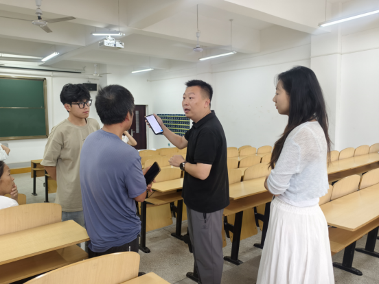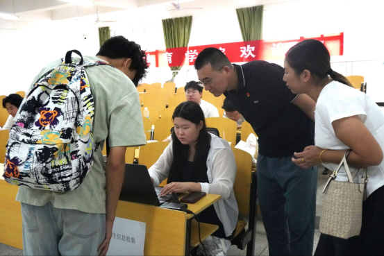 陈龙一行领导对本次迎新工作高度重视,深入一线开展工作,对入学新生和工作人员表达了亲切关怀,并提供细致指导。领导们先是检查了各报到区的设备运行情况,从信息登记用的电脑到指引标识,逐一确认设备正常运转,确保报到流程高效顺畅,避免因设备问题耽误新生入学进度。迎新期间,陈龙一行主动走近新生与家长,亲切与之交谈。他们耐心介绍学院的学科优势、师资力量、校园文化等特色,解答家长关于孩子学习生活的担忧。同时倾听新生的困惑,从专业学习规划到校园生活适应,逐一细致解惑,让新生和家长真切的感受到学院的重视与关怀。