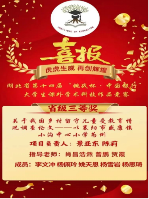团队项目《育龄人口为何不愿生了-高校大学生自我同一性对生育意愿影响,领悟社会支持的中介作用》、团队项目《建设特色化小学课堂,拓展黄陂区非遗传承研究——以黄陂木版年画为例》、团队项目《关于我国乡村留守儿童受教育情况调查论文——以襄阳市盛康镇小沟中心小学为例》、团队项目《融合教育环境下普通儿童和孤独症儿童的互动研究》分别入选省级荣誉公示名单。祝贺以上团队。
