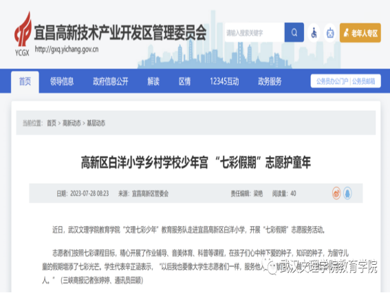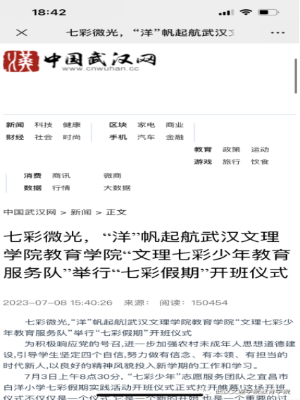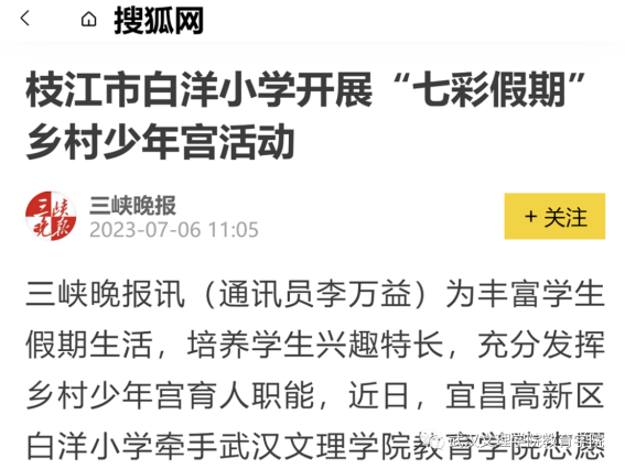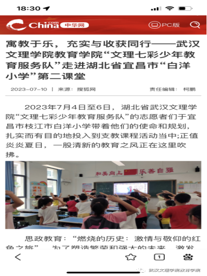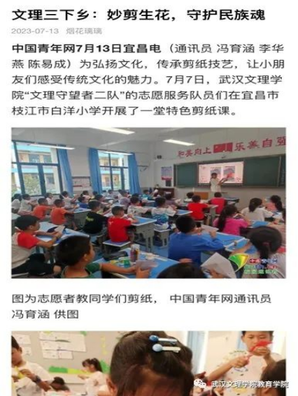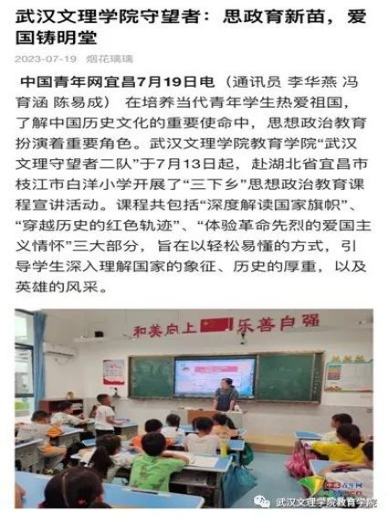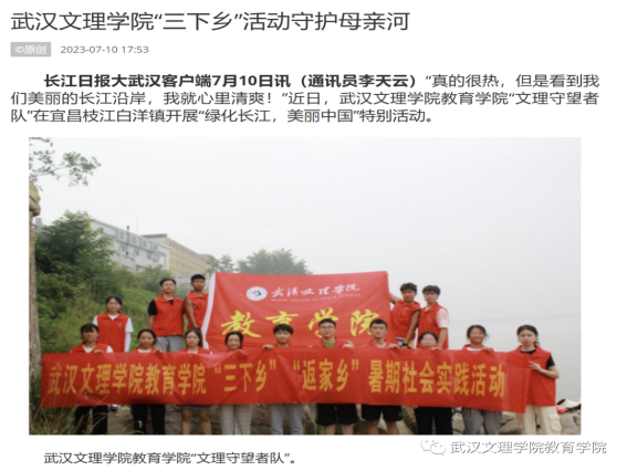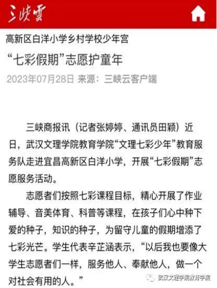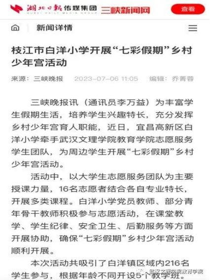为引导和帮助广大青年学生上好与现实相结合的“大思政课”,在社会课堂中“受教育、长才干、作贡献”,坚定信念听党话、跟党走,践行党的二十大主要精神,304永利集团“文理七彩少年教育服务队”在七月一日至七月中旬暑假期间,赴宜昌市枝江市白洋镇城区、白洋镇长江边,高新区白洋小学等地开展2023年“三下乡”主题暑期社会实践活动。