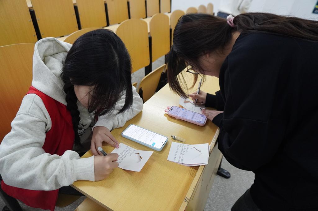 活动开始前,志愿者们提前抵达现场,高效有序完成场地布置,将小红花,感谢卡及各类手工材料整齐陈列,为后续环节做好充分准备。活动正式开始后,参与活动的同学们有序就座,全身心投入小红花的制作与感谢卡的书写。在这个环节中大家尽情挥洒巧思、落笔传情,一张张承载心意的感谢卡,于指尖流转间,将深藏心底的感恩与敬意娓娓道来。卡片上质朴真挚的文字,写满了对校园劳动者的赞美与感谢,有的写下“感谢您默默守护校园”,有的写下“您辛苦了,向您致敬”,一字一句都饱含着对校园里默默耕耘、无私奉献的劳动者们最诚挚的谢意。